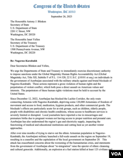 Ամերիկան համաշխարհային առաջատար է մարդու միջազգային իրավունքների հարցում և պետք է շարունակի ծառայել որպես տարածաշրջանում խաղաղության միջնորդ և աջակից: Որպեսզի Ադրբեջանը պատասխանատվության ենթարկվի Լեռնային Ղարաբաղի շրջափակման և հարձակման իր գործողությունների համար, մենք հարգանքով խնդրում ենք, որ ձեր գերատեսչությունները գործադրեն Գլոբալ Մագնիտսկու ակտի համաձայն գործող լիազորությունները՝ նպատակաուղղված պատժամիջոցներ կիրառելու Ալիևի կառավարության այն անձանց նկատմամբ, որոնք պատասխանատու են կամ մասնակցում են մարդու իրավունքների խախտմանը Լեռնային Ղարաբաղում»- ասված է նամակում: